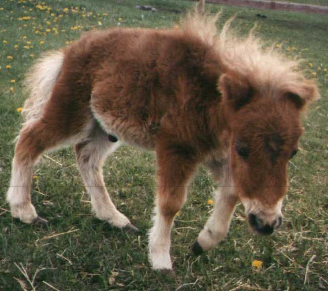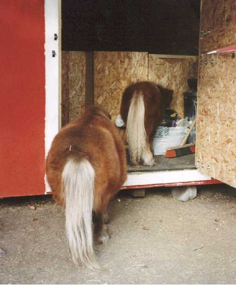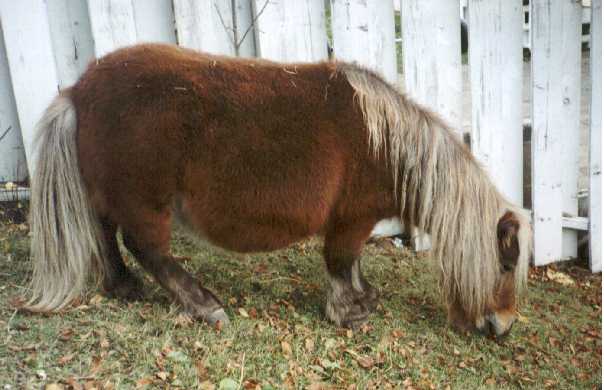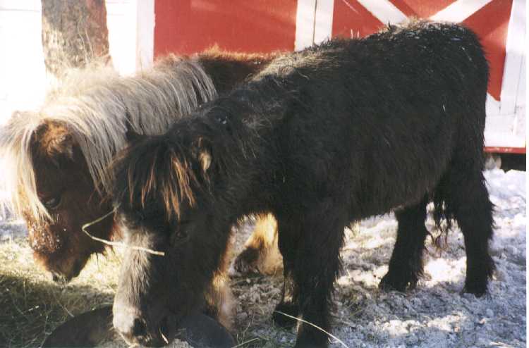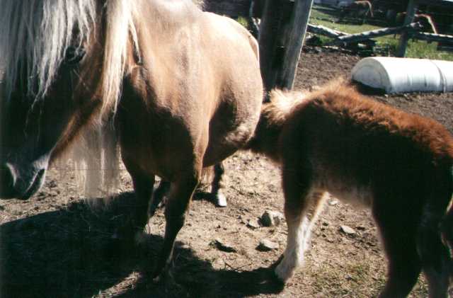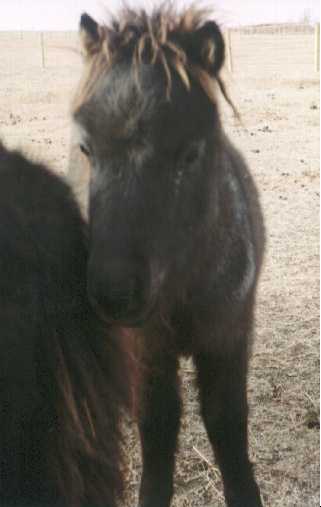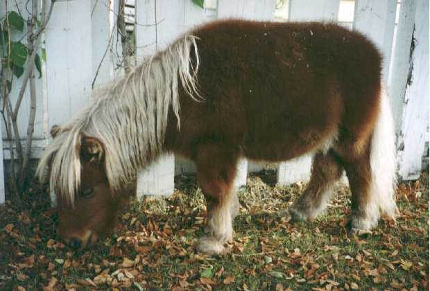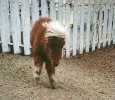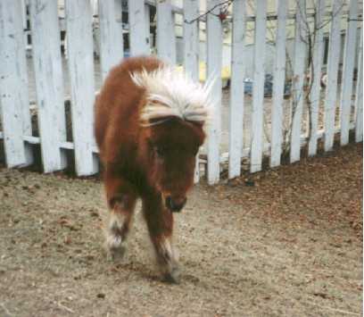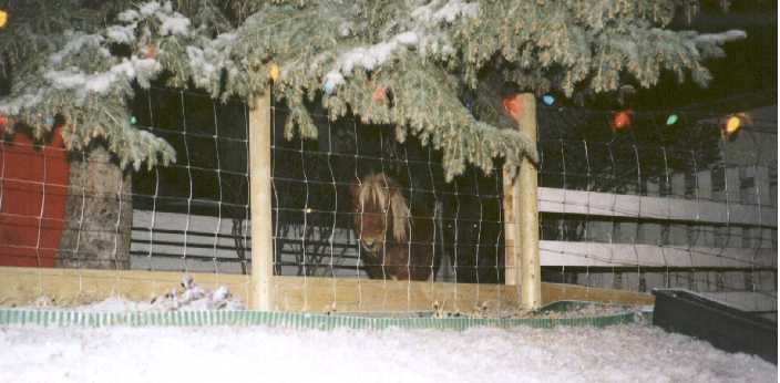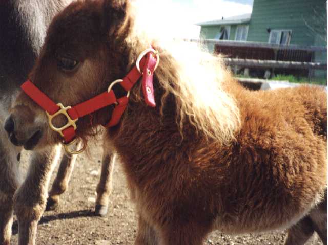 Poohbear and his dam Penelope (Pen-el-o-pee) arrived on August 17th, 1997 after months of preparation to build their new home for them in my backyard. It took a lot of time and work, but it was well worth it. Penelope stayed with me and PoohBear in the city until November 23, 1997 when I had to make a hard choice. I had become very fond of my special little mare, but I also knew that she would be better off back on the farm, and that PoohBear would be better off with a playmate his own age and sex (thus eliminating the need to castrate him). So, with no small amount of sadness, I sent Penelope back to her farmland home, and exchanged her for my new colt - Russel's Dirk.